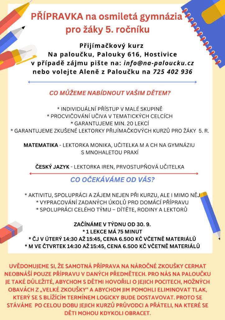 - Přípravka s Iren a Monikou: příprava k přijímačkám na osmiletá gymnázia – ČJ a M. Intenzivní přípravné kurzy pod vedením zkušených lektorek, které jsou zaměřeny na činnosti vedoucí k maximálnímu procvičování učiva a typových úloh, které jsou součástí přijímacího řízení. Kroužek je určený dětem 5. ročníku.